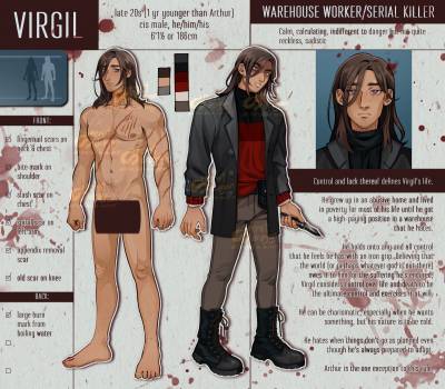 Virgil grew up in one of the poorest areas near Spokane, living out of a run-down mobile home. He didn't have his own bedroom and slept in the living room. His parents enrolled him in public school, but after he turned 12 they wouldn't drive him themselves and wouldn't put in the effort to ask the school to assign him a bus stop. His neighbor, an old butch, caught him walking down the road at 4:30 am and took it upon herself to drive him to school herself. His mother was physically abusive and his father was never home so he actually ended up becoming really attached to this neighbor and visited her frequently; she later told him he was the son she never had. When he was 16, Virgil's father found out that he had been spending time with a lesbian and shot her. She survived, but moved away, and Virgil was left alone with his parents again. He had struggled to make friends at school his entire life because he was severely traumatized, so he started looking into psychology and had a very long phase of trying to act like a Normal Person and freaking people out because what the fuck the quiet greasy boy suddenly started becoming social????????? Anyway something something at 17 his father finds out he's gay and Virgil kills him in self-defense which kickstarts his murderous habits and religious-adjacent delusions. He left home after that and has not seen nor spoken to his mother in 8+ years